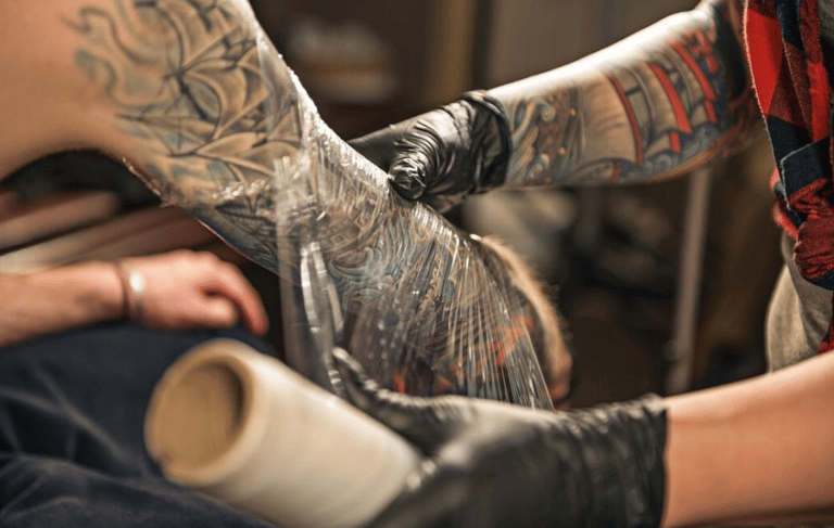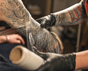 Commonly used for larger or solid, color-packed tattoos, plastic wrap will protect your tattoo and clothing until you get home.