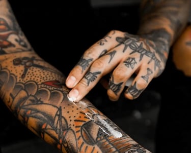 Moisturize the tattoo for ~3 weeks after completion. A thin layer throughout the day is the best way. Applying too much at once doesn’t allow the skin to breathe and makes it difficult to heal naturally.
